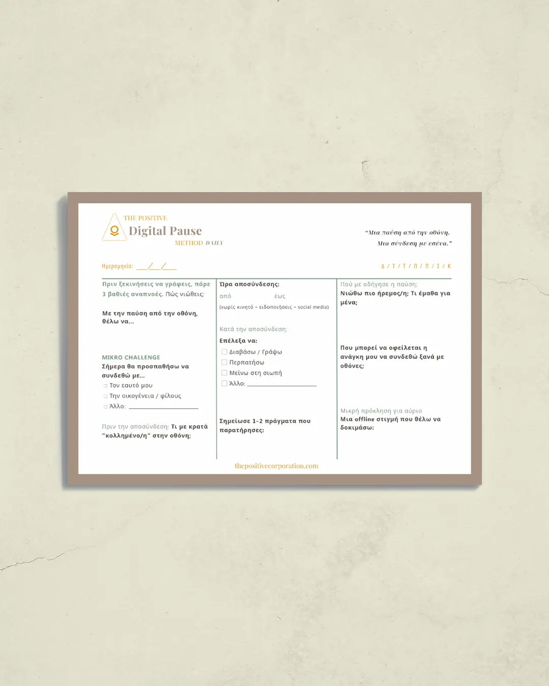 Για τον άνθρωπο που θέλει να βάλει όρια στο πόσο «καταναλώνει» την τεχνολογία και να ξαναβρεί χρόνο και χώρο για τον εαυτό του—αυτό το εργαλείο σας οδηγεί βήμα–βήμα σε μία πιο mindful καθημερινότητα.